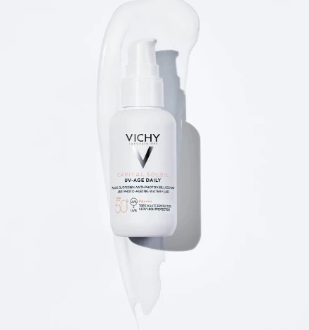 منتج VICHY CAPITAL SOLEIL UV-AGE DAILY ANTI-PHOTO-AGEING WATER FLUID SPF 50+ 40ML من فيشي هو واقي شمس يومي مضاد للشيخوخة الضوئية. تركيبته المتطوّرة بالنياسيناميد وبيبتيد C+ تحمي من UVA و UVB مع محاربة علامات الشيخوخة المبكّرة مثل التجاعيد والبقع الداكنة. ملمس مائي خفيف جداً يُمتص فوراً. مثالي تحت المكياج. للاستعمال اليومي لمنع الشيخوخة الضوئية. مناسب لجميع أنواع البشرة.