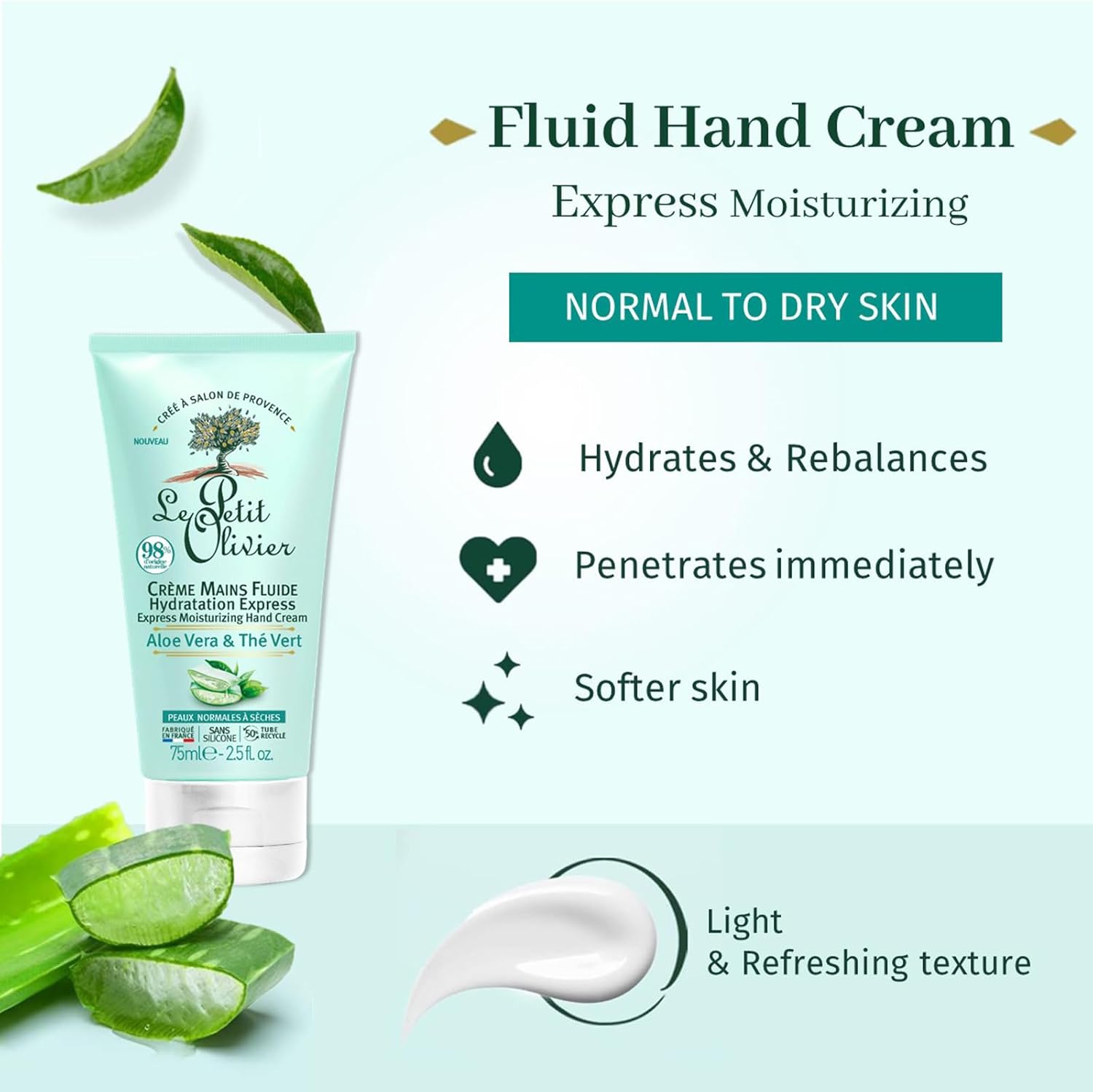 🇫🇷 Crème Mains Fluide Hydratation Express Le Petit Olivier – Aloe Vera & Thé Vert